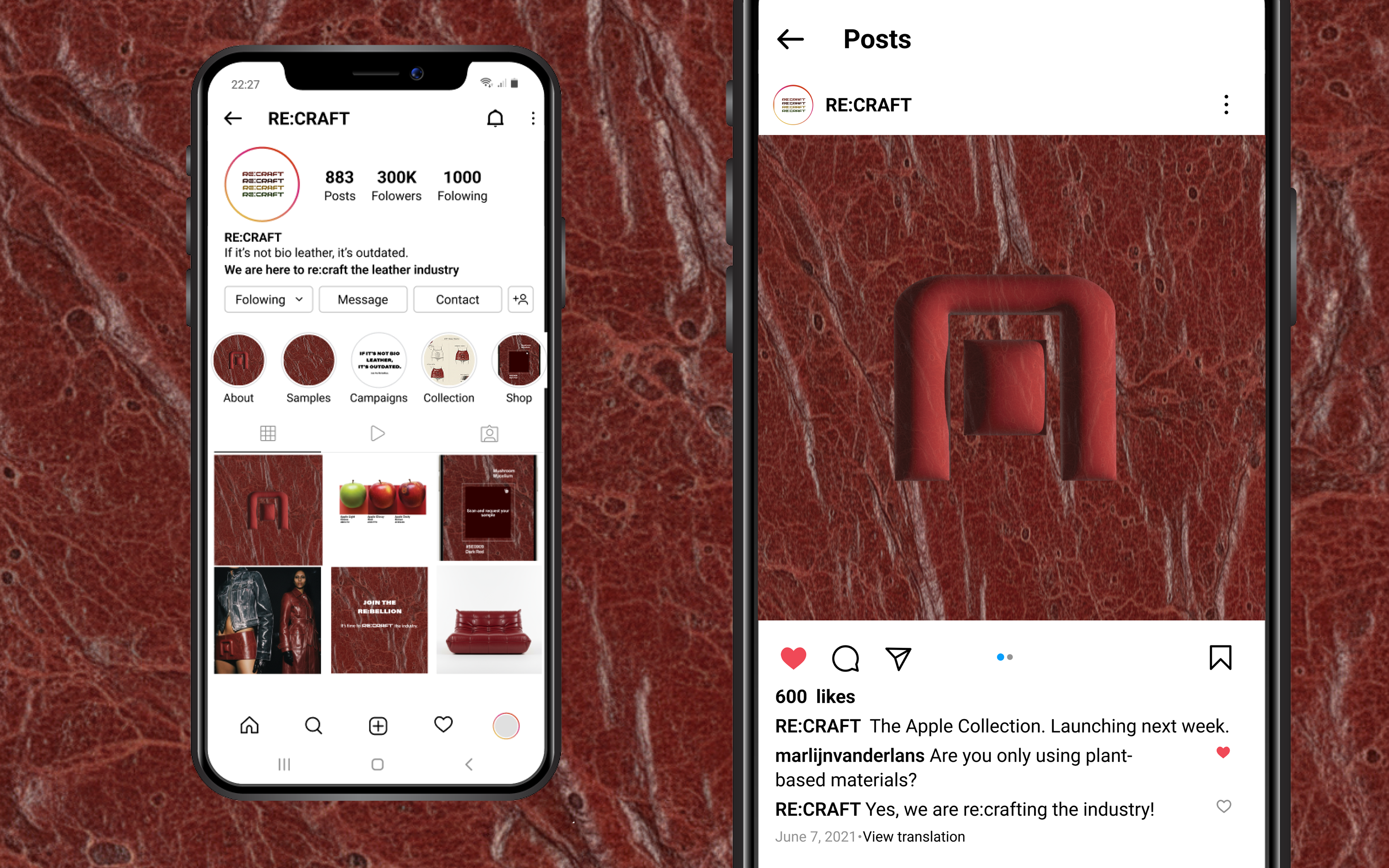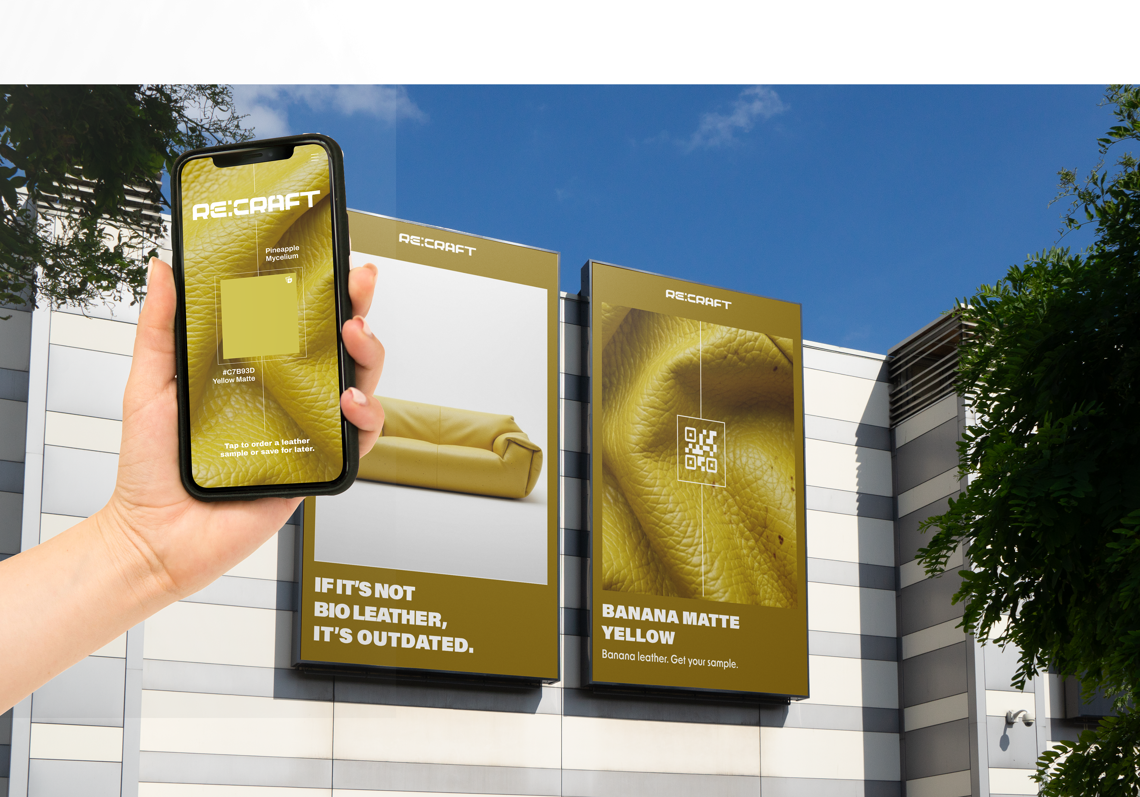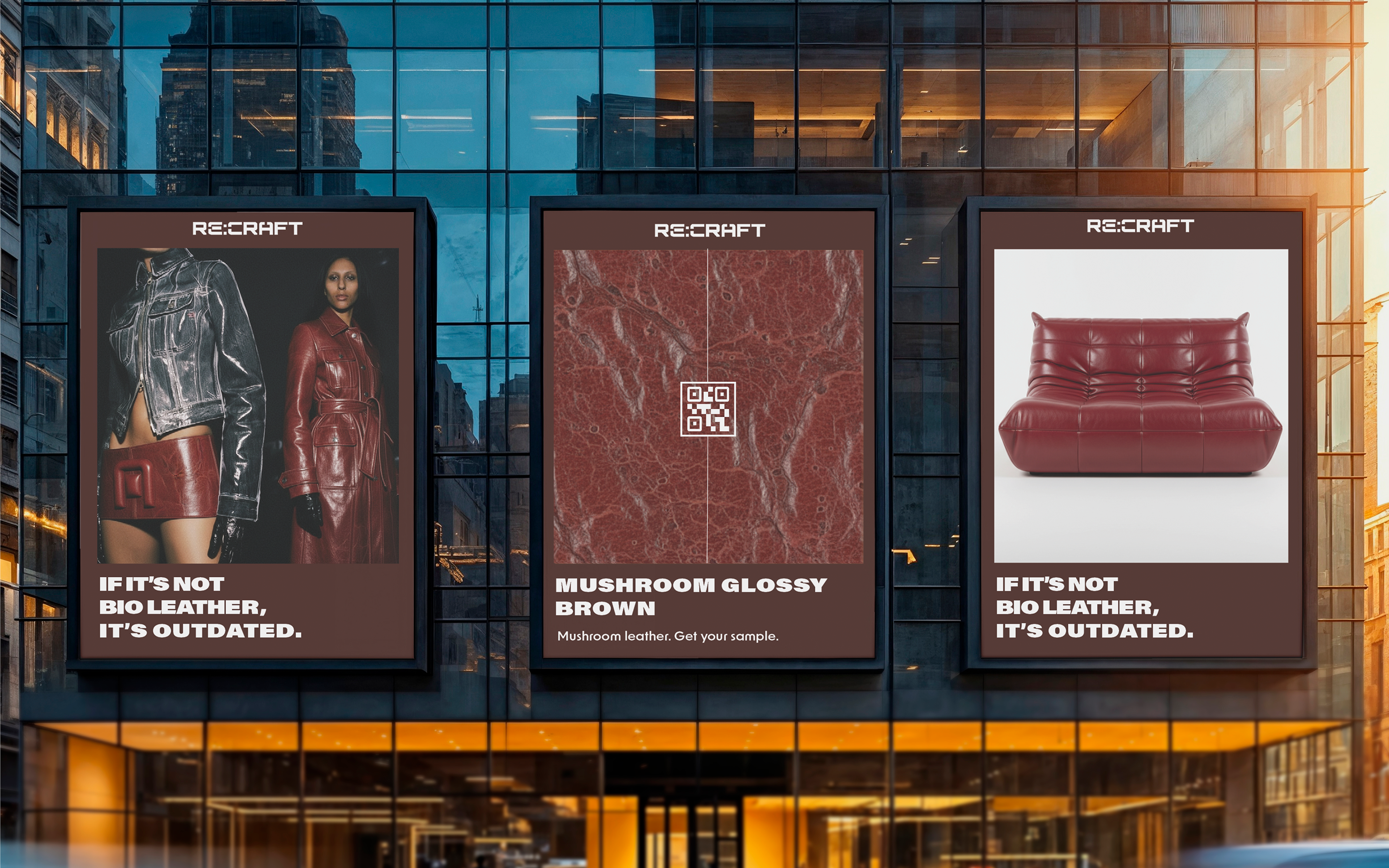 Re:craft’s brand identity was created from the ground up, establishing a visual system that positions bio-leather as a premium alternative for fashion and interior design.